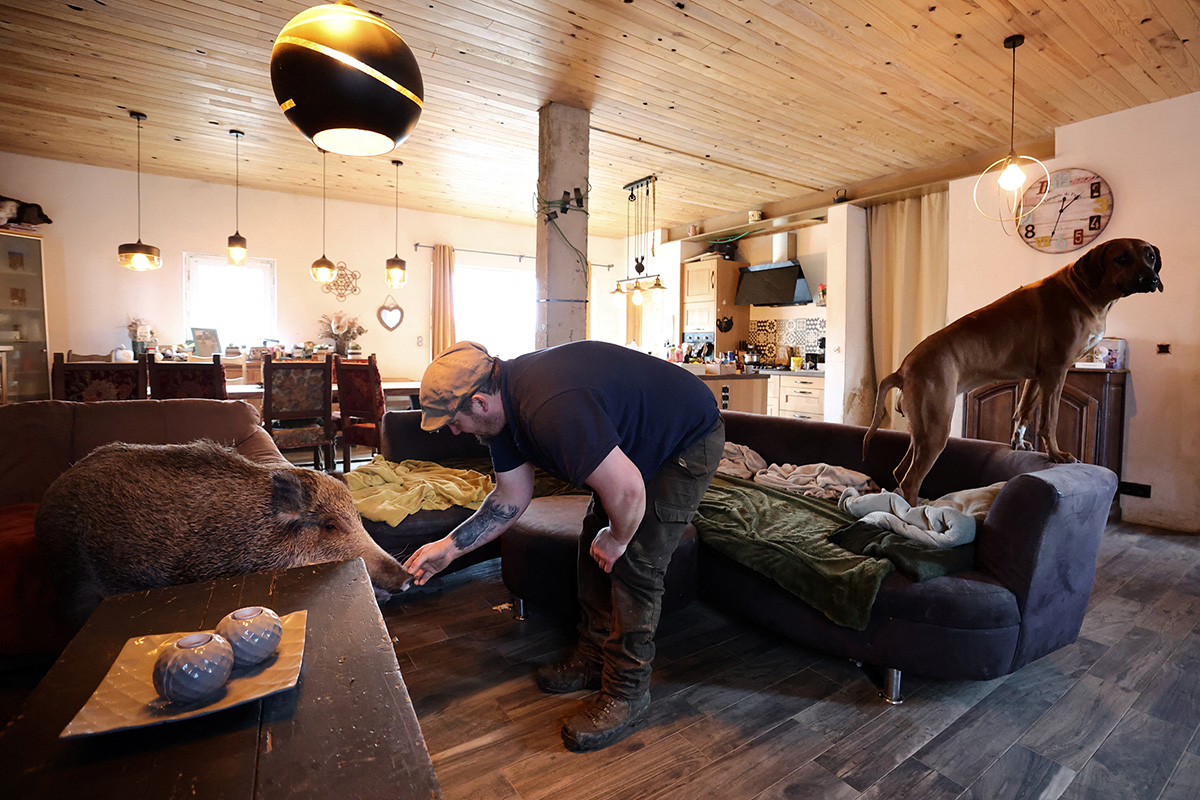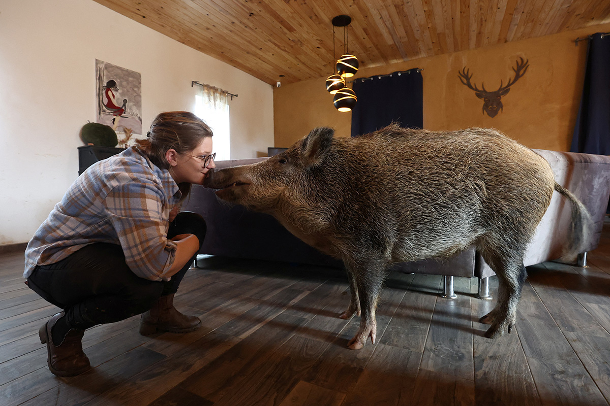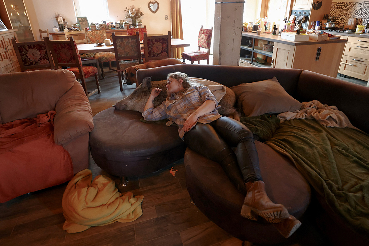 Тіффані П'єр, дружина Грегорі Гійо з бельгійського регіону Валлонія, лежить на дивані поряд з 80-кілограмовим диким кабаном Оскаром, який мешкає з ними в їхньому будинку в Ланевілі, Бельгія, 12 лютого 2024 року. Фото: ReutersБельгійська пара прихистила дикого кабана і настільки прив'язалася до нього, що оселила у своєму будинку. Грегорі Гійо виявив маленьке поросятко під час полювання зі своїми собаками — і вирішив взяти його до себе на тимчасове утримання. Відтоді минуло більше року, а 80-кілограмовий кабан, названий Оскаром, досі живе в будинку пари — він має власний диван, подушки та ковдру.