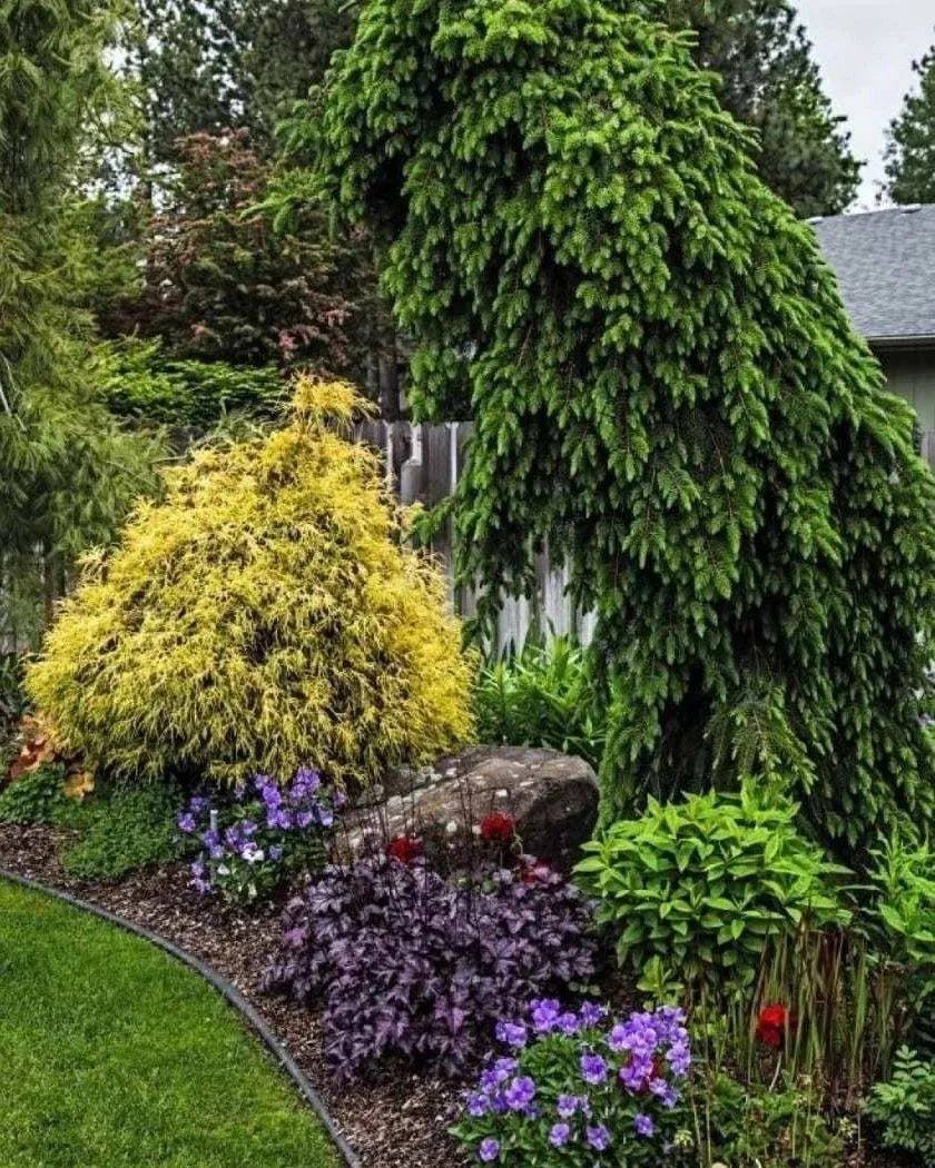 Різні садові композиції. В комбінації з іншими видами рослин і хвойними деревами ялина Інверса може створювати захоплюючі композиції, які прикрашають будь-який сад.