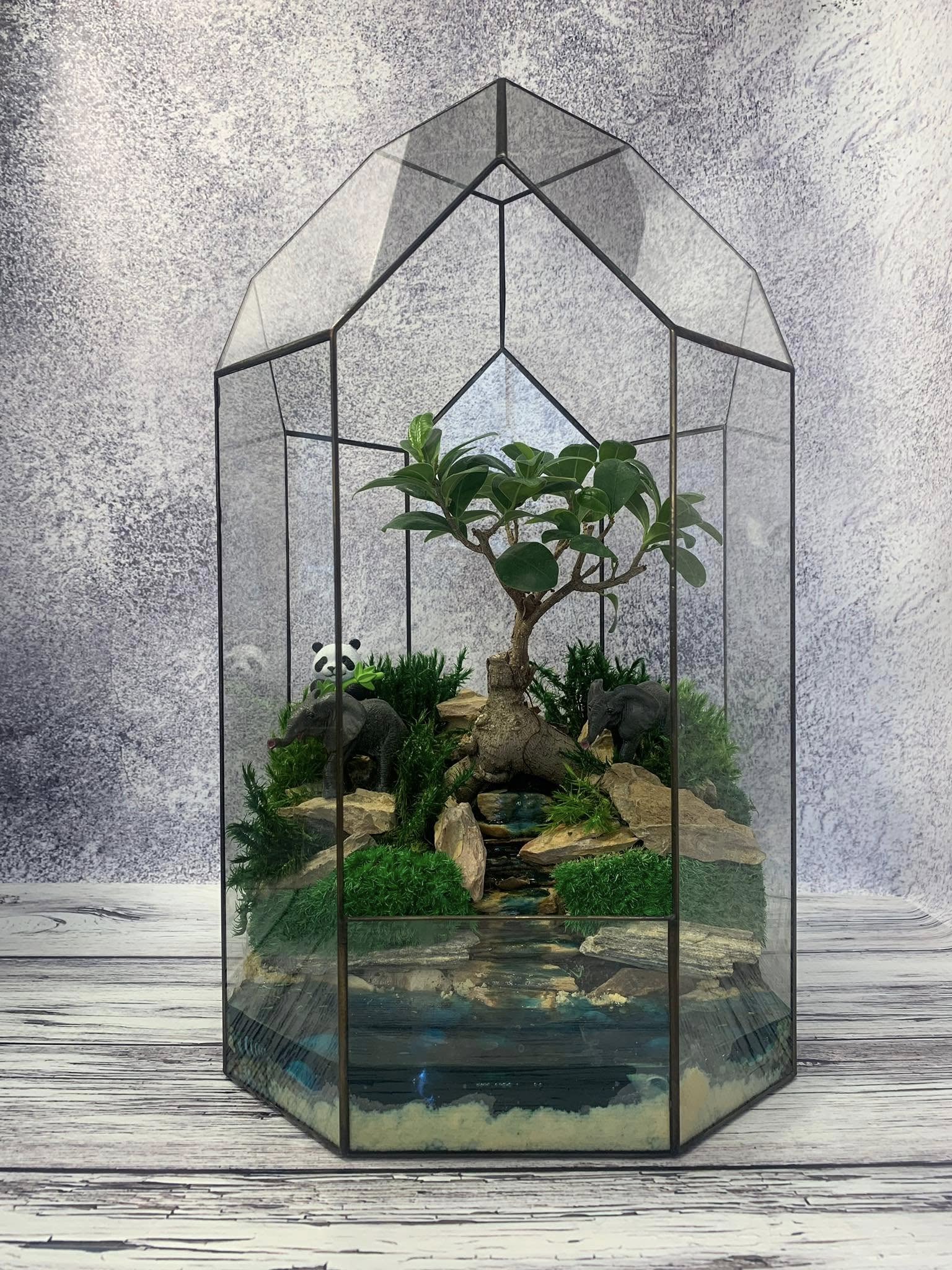 Флораріум — це справжня магія! Усередині скляної ємності створюється маленький ліс, пустеля чи навіть тропіки. Ви можете додати декоративні елементи: фігурки тварин, крихітні будиночки, камінці, які зроблять композицію ще живішою.