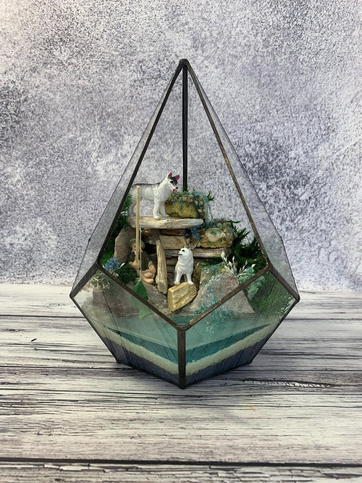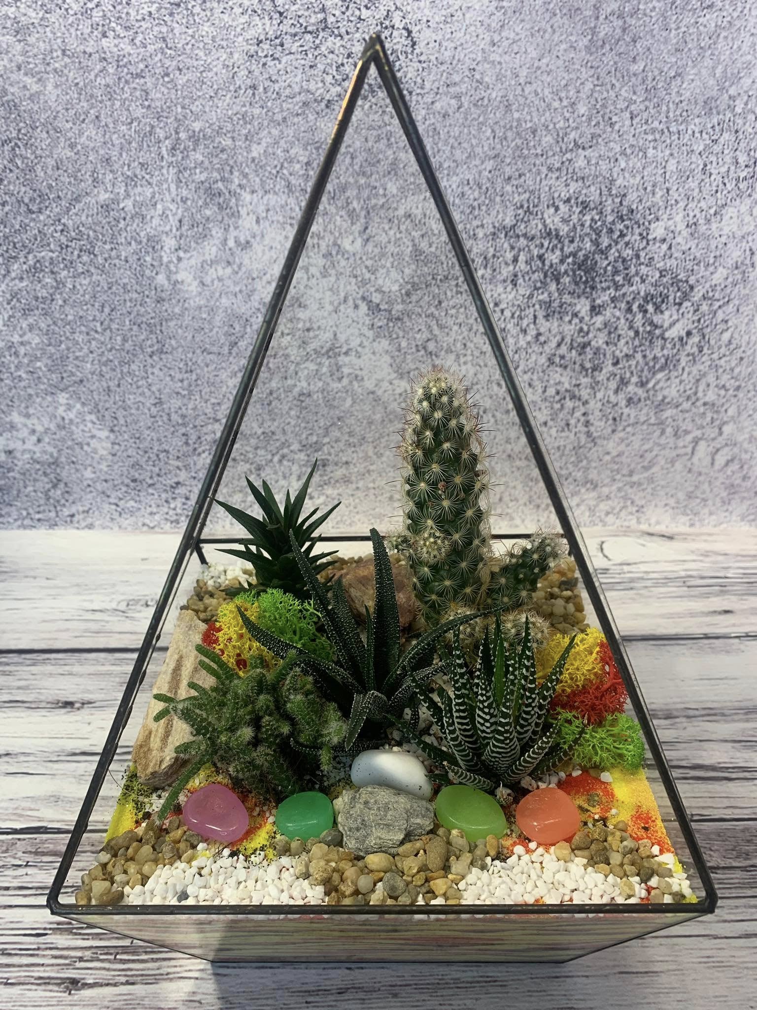 Флораріуми бувають різними: від геометричних форм (куби, піраміди) до класичних круглих акваріумів. Ви можете створити пустельний флораріум із кактусами, тропічний — із мохом і папоротями, чи навіть тематичний — наприклад, зимовий ліс із маленькими ялинками.