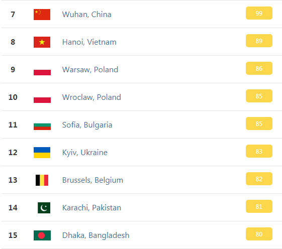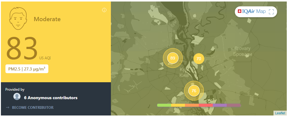Індекс київського повітря складає 83. Це вважається «помірно брудним» повітрям.