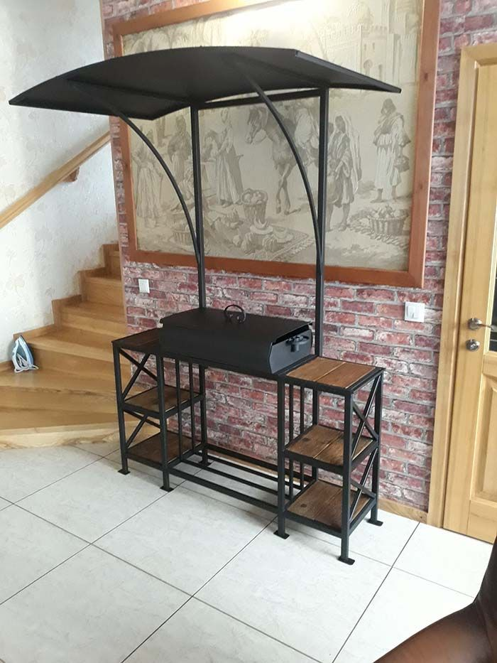 Якщо ви не хочете облаштовувати стаціонарне місце, чудовий варіант — мангал на металевій рамі з колесами. Його можна переміщати залежно від потреби, а для зручності доповнити дерев'яною полицею для спецій та аксесуарів.