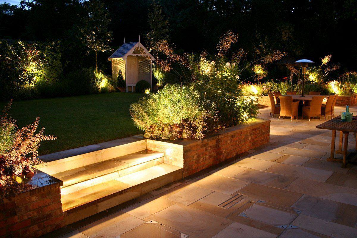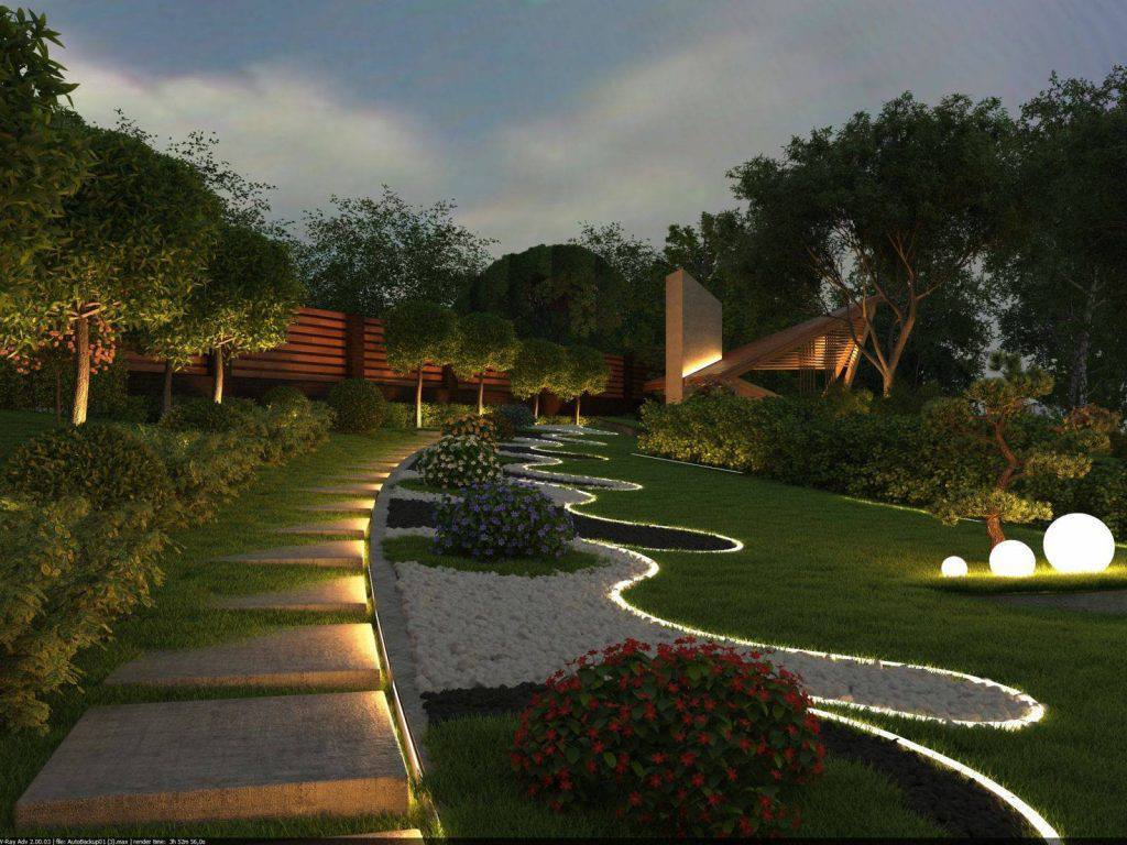 - Естетика. Світло підкреслює красу рослин, архітектурних елементів (альтанок, фонтанів) і створює глибину простору.
