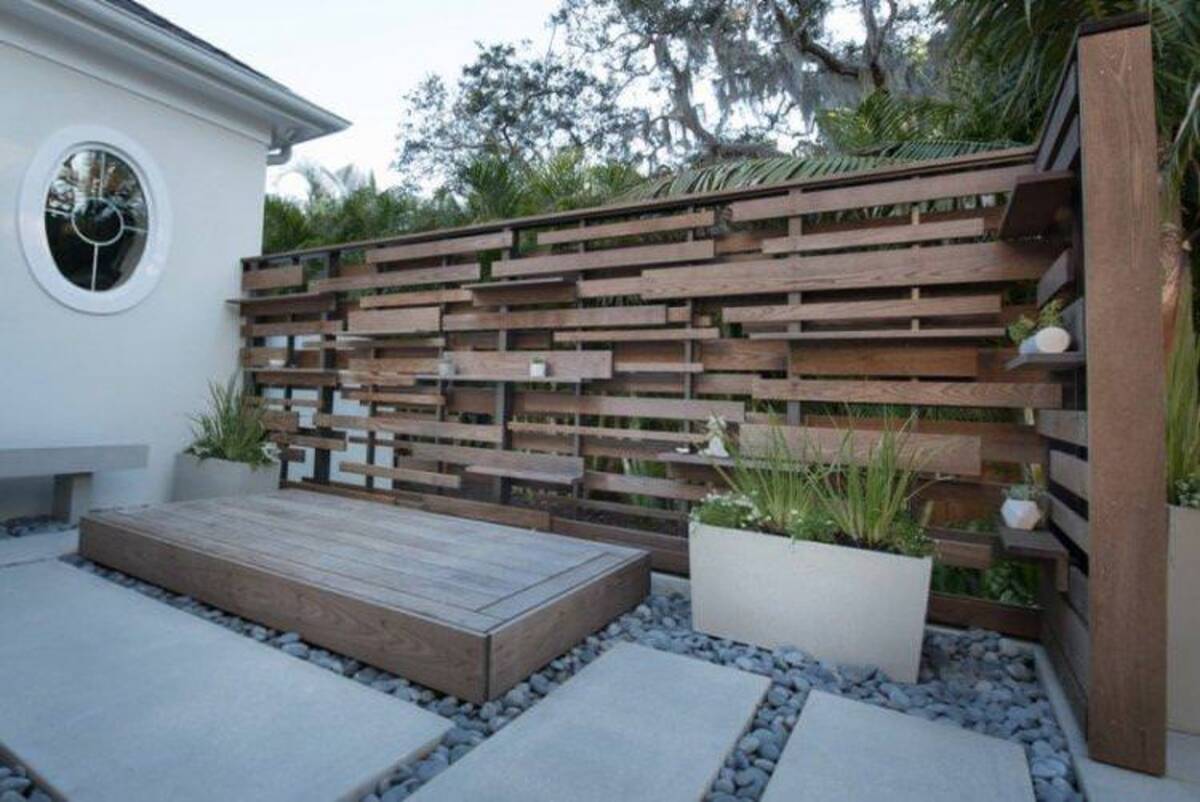 Сучасні мінімалістичні двори виграють від використання габіонних конструкцій, металевих секцій із геометричними візерунками чи комбінованих варіантів дерева й бетону.