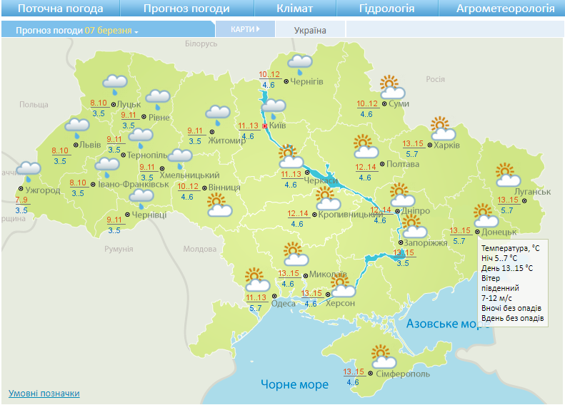 Далі 7 березня дощі очікуються у західному регіоні: у Закарпатської, Тернопільської, Івано-Франківської, Львівської, Чернівецької, Рівненської, Волинської, Хмельницької обл. Також дощитиме у Житомирської, Чернігівської та Київської обл.