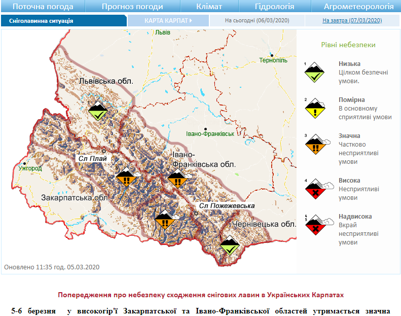 Також Укргідрометцентр інформує про стан лавинної небезпеки у Карпатах. Значний рівень небезпеки спостерігається в Івано-Франківської обл., у Львівської та Чернівецької обл. – цілком безпечні умови.
