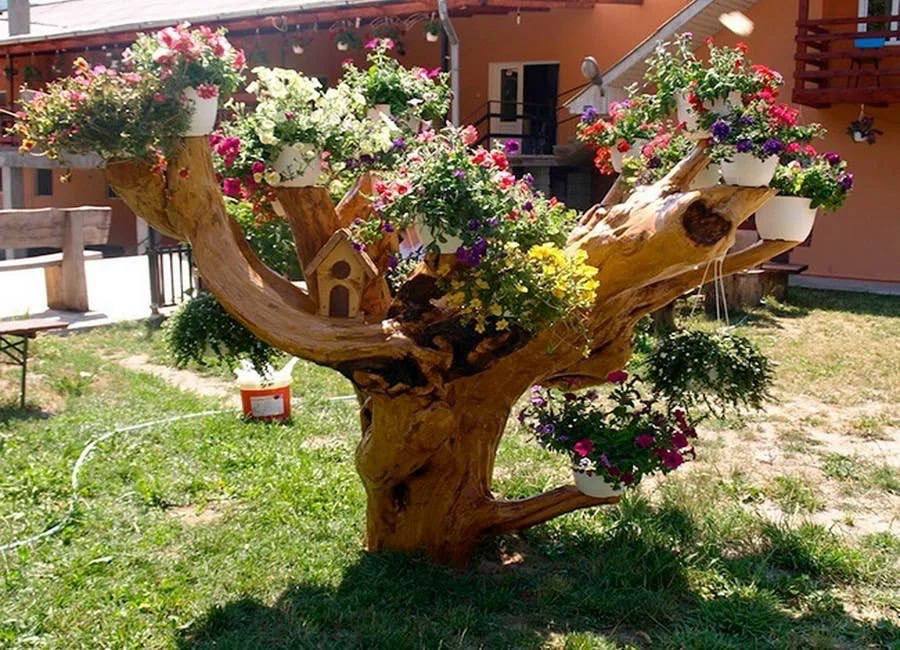 Спочатку може здатися, що це неможливо, але насправді ця ідея досить реалізована. Існують різні способи, як це можна зробити. Одним із них є використання стовбура живого дерева як опори для клумб. Це може бути дерево з горизонтальною гілкою чи спеціально призначені структури для кріплення. Садіть квіти та рослини на цій горизонтальній площині, створюючи ефектні композиції.