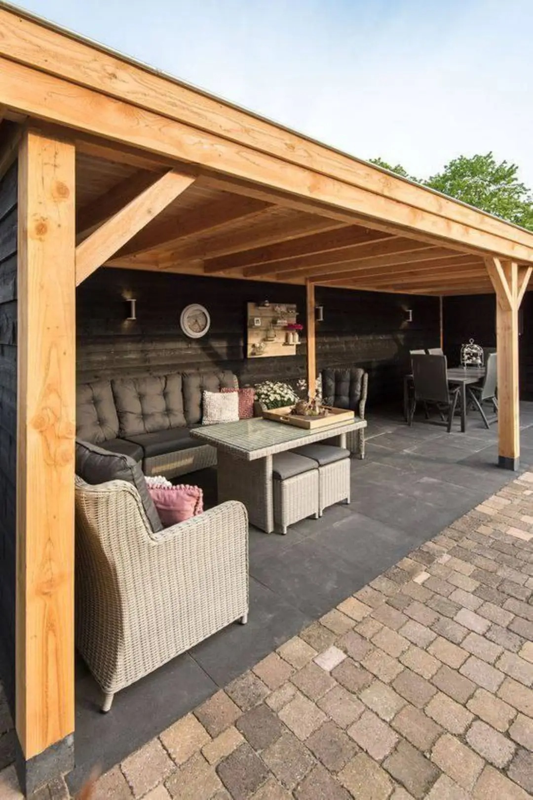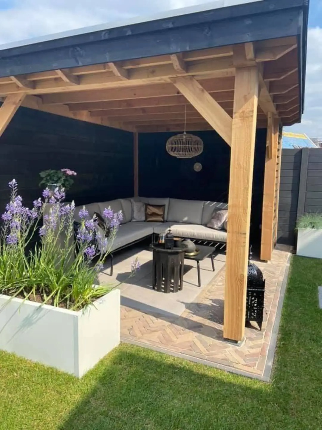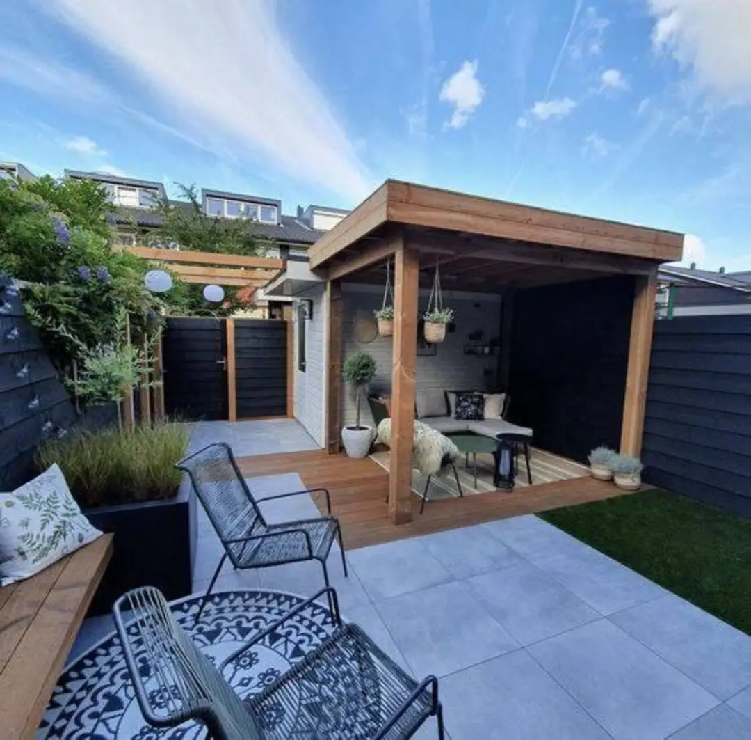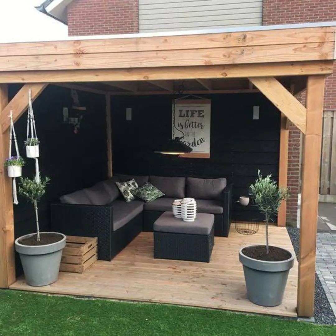 Гармонія кольорів і фактур: внутрішні стіни альтанок часто фарбують у темні кольори (наприклад, чорний), що створює елегантний контраст із натуральним кольором дерева та світлими подушками меблів. Це додає простору глибини та сучасності. Підлога може бути виконана з дерев'яного настилу, плитки чи бруківки, що дозволяє підкреслити загальний стиль ділянки та забезпечити практичність у догляді.