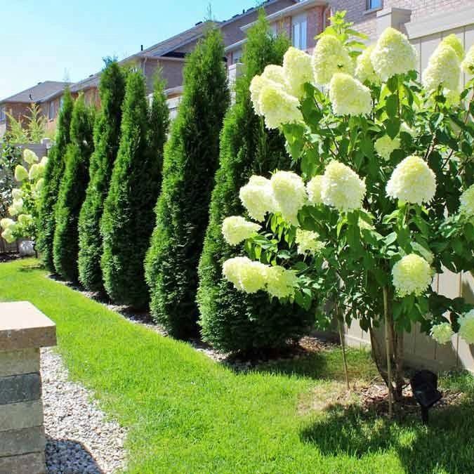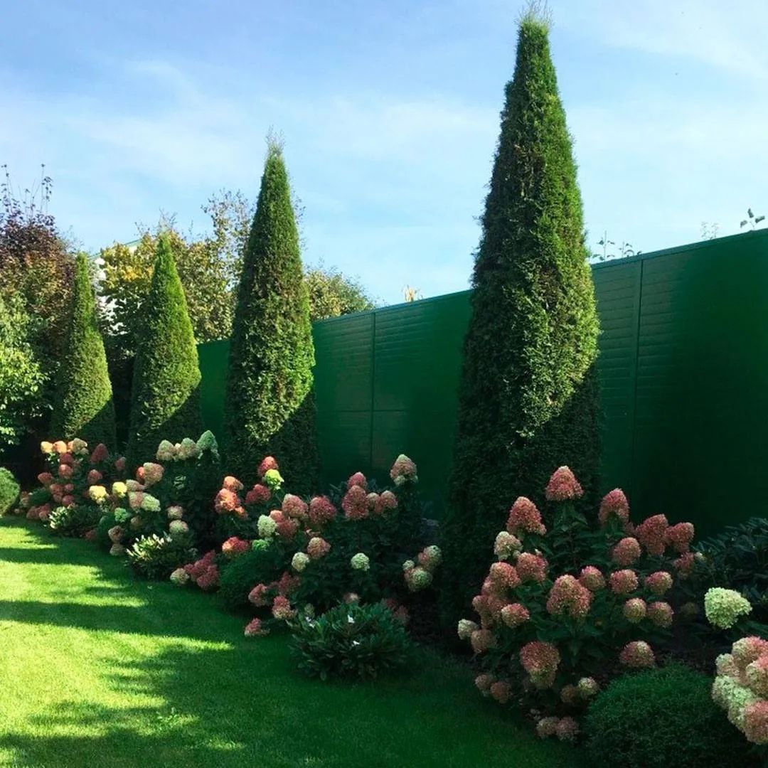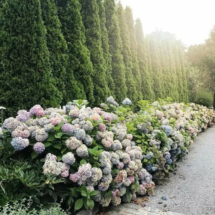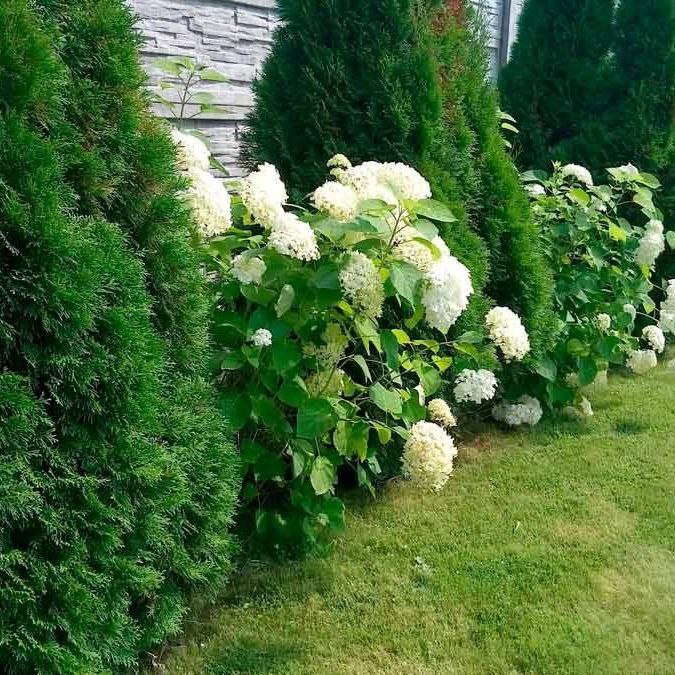 Туї виростають високими, тому оптимально використовувати їх для оформлення заднього ряду. Тоді вони височать над гортензіями, і дві рослини ефектно доповнять одна одну.