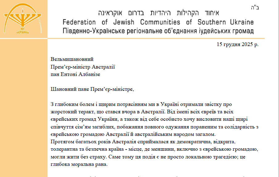 GreenPost публікує фрагмент листа. Повний варіант можна прочитати за посиланням rabbi-wolff-letter-to-australian-pm-on-antisemitic-attack-australia.pdf.