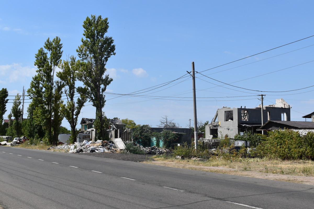 Рухаючись трасою вперед, у бік закритого мосту, перед яким розміщується блокпост, можна побачити все більше пошкоджених або зовсім знищених обстрілами будівель. За мостом — дві третини міста та безпосередньо його центр, але потрапити туди зараз неможливо.