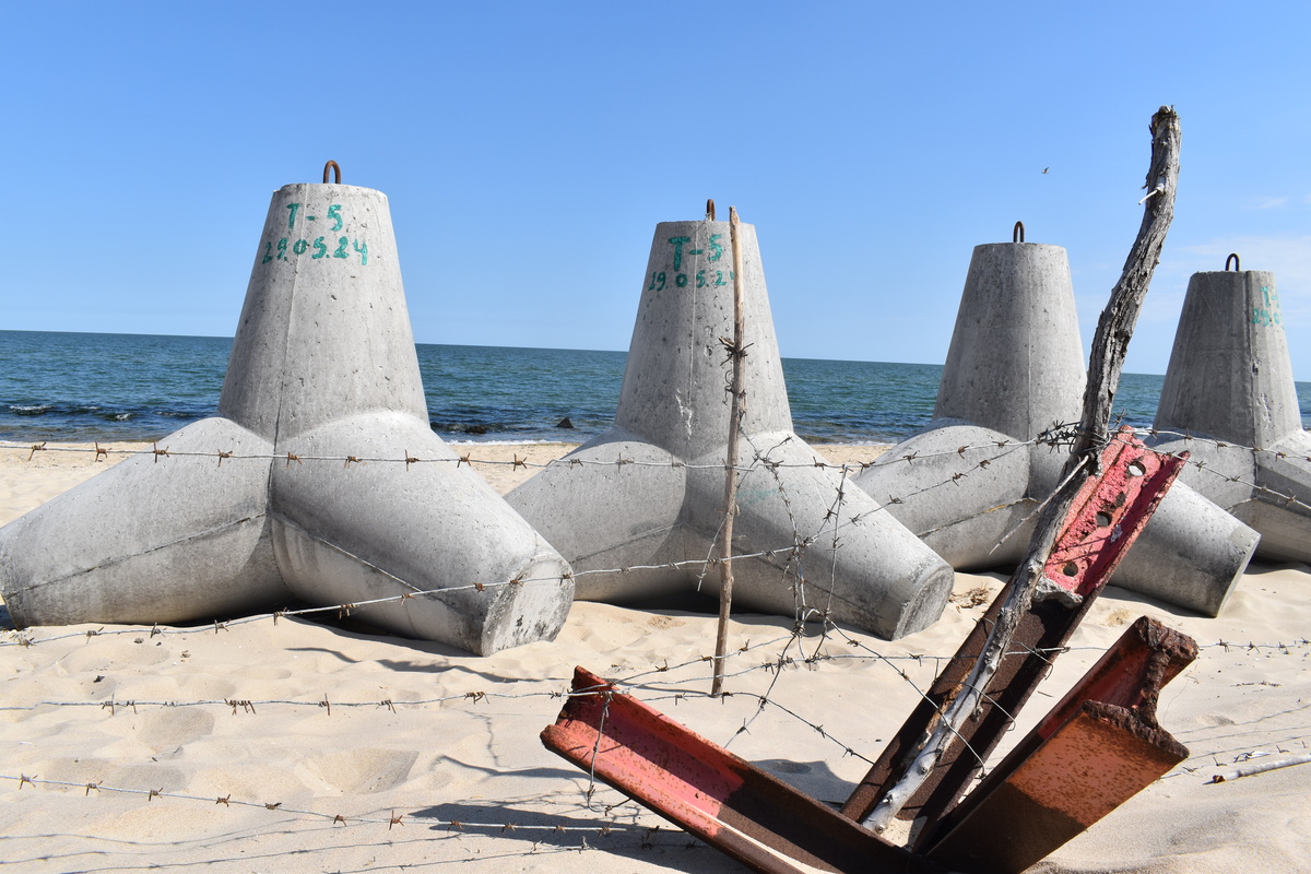 Із заходу над пляжем нависають громіздкі будинки зачинених готелів, а пляж упирається в оборонні споруди, за якими тягнеться абсолютно безлюдний, занедбаний краєвид.