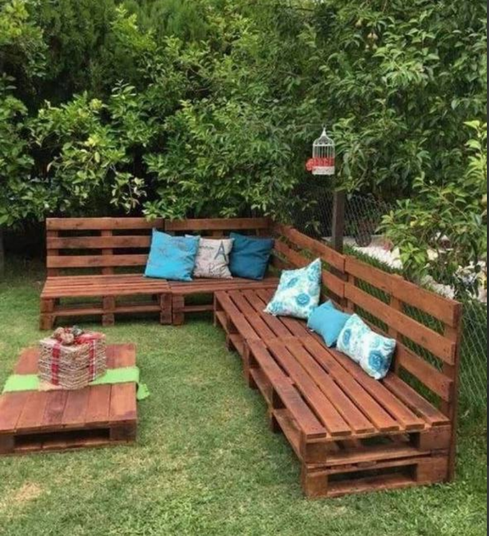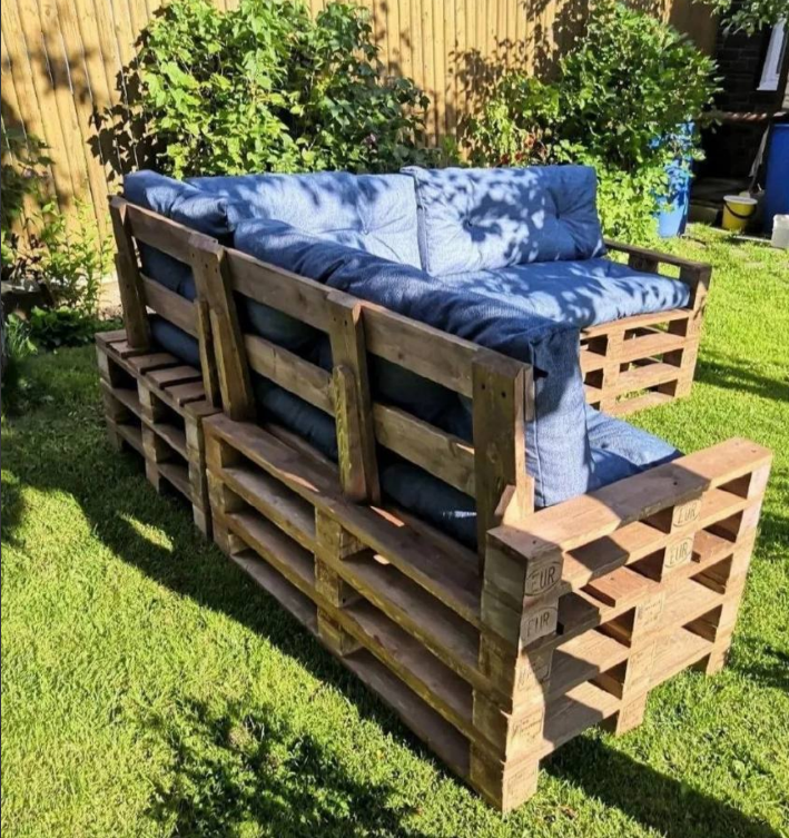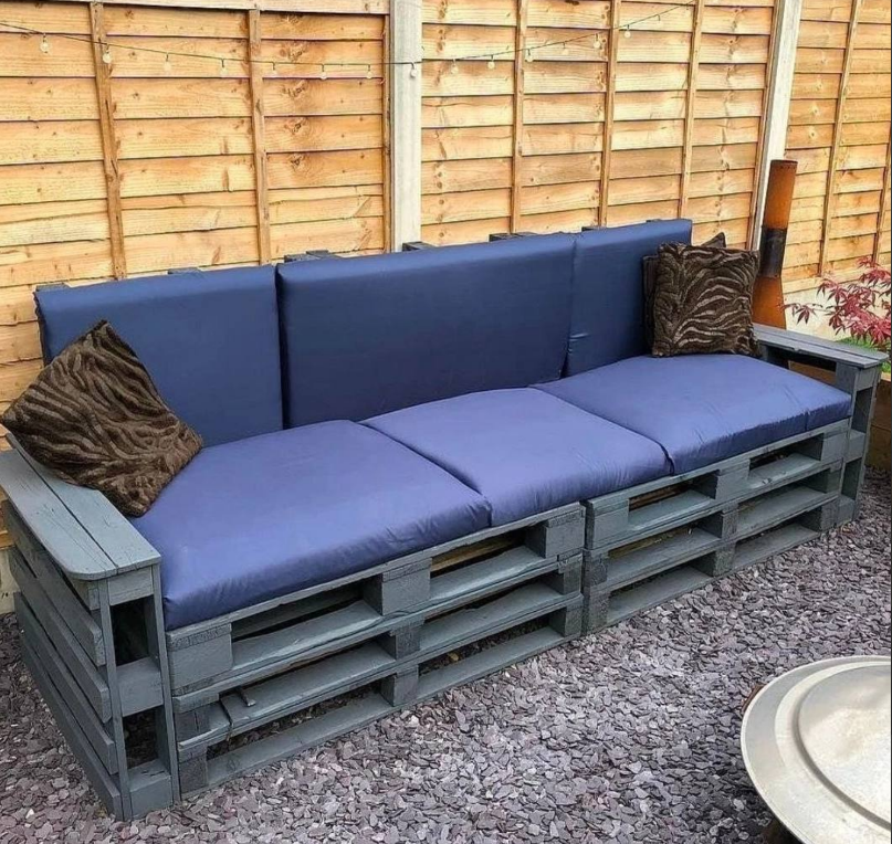 - Зручні дивани та лаунж-зони. Склавши кілька піддонів, отримаєте каркас для садового дивана. Додайте подушки — і зона відпочинку готова.