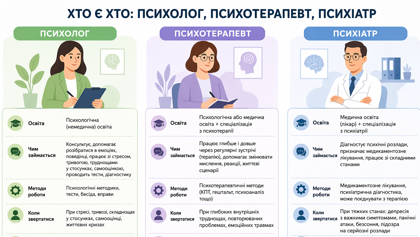 Умовно: зі стресом працює психолог, із глибинними внутрішніми труднощами — психотерапевт, а з тяжкими розладами — психіатр.