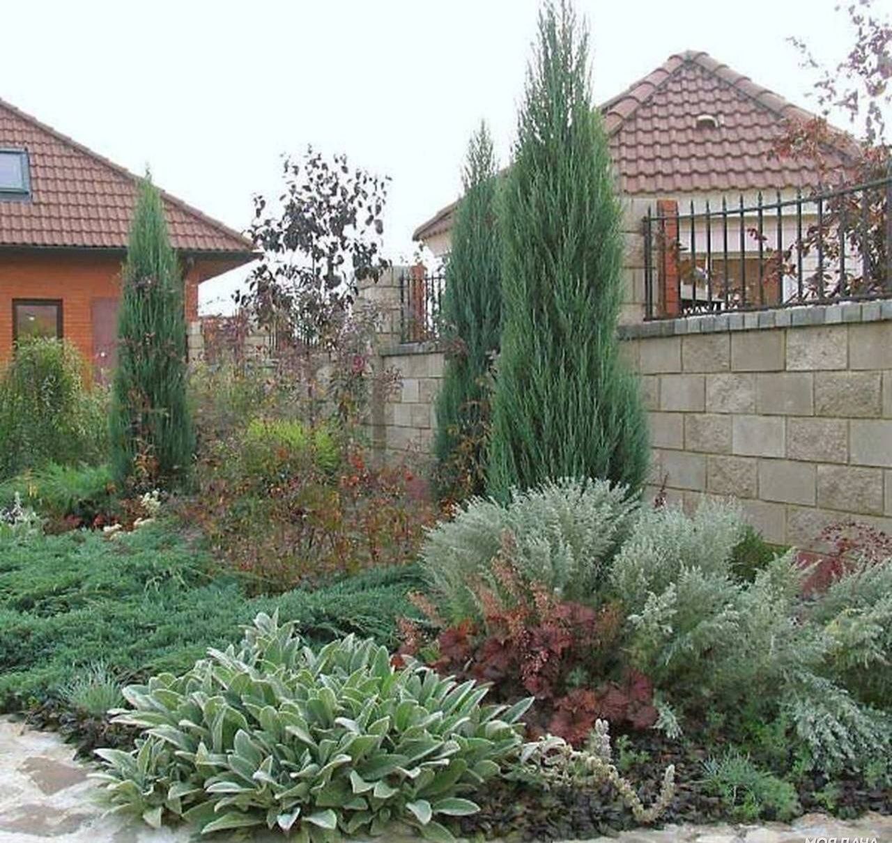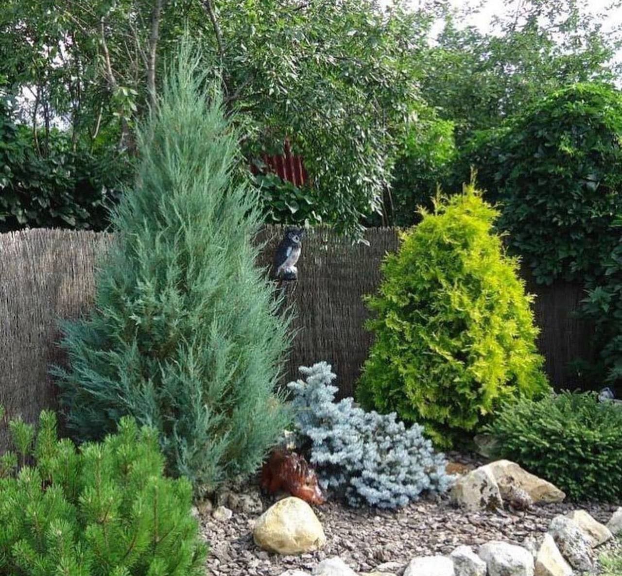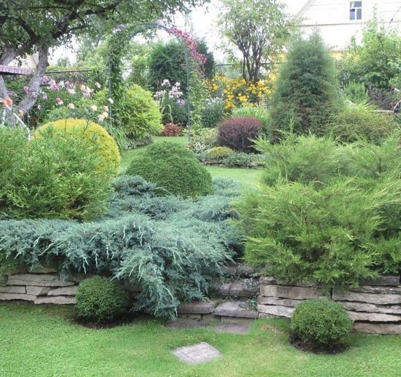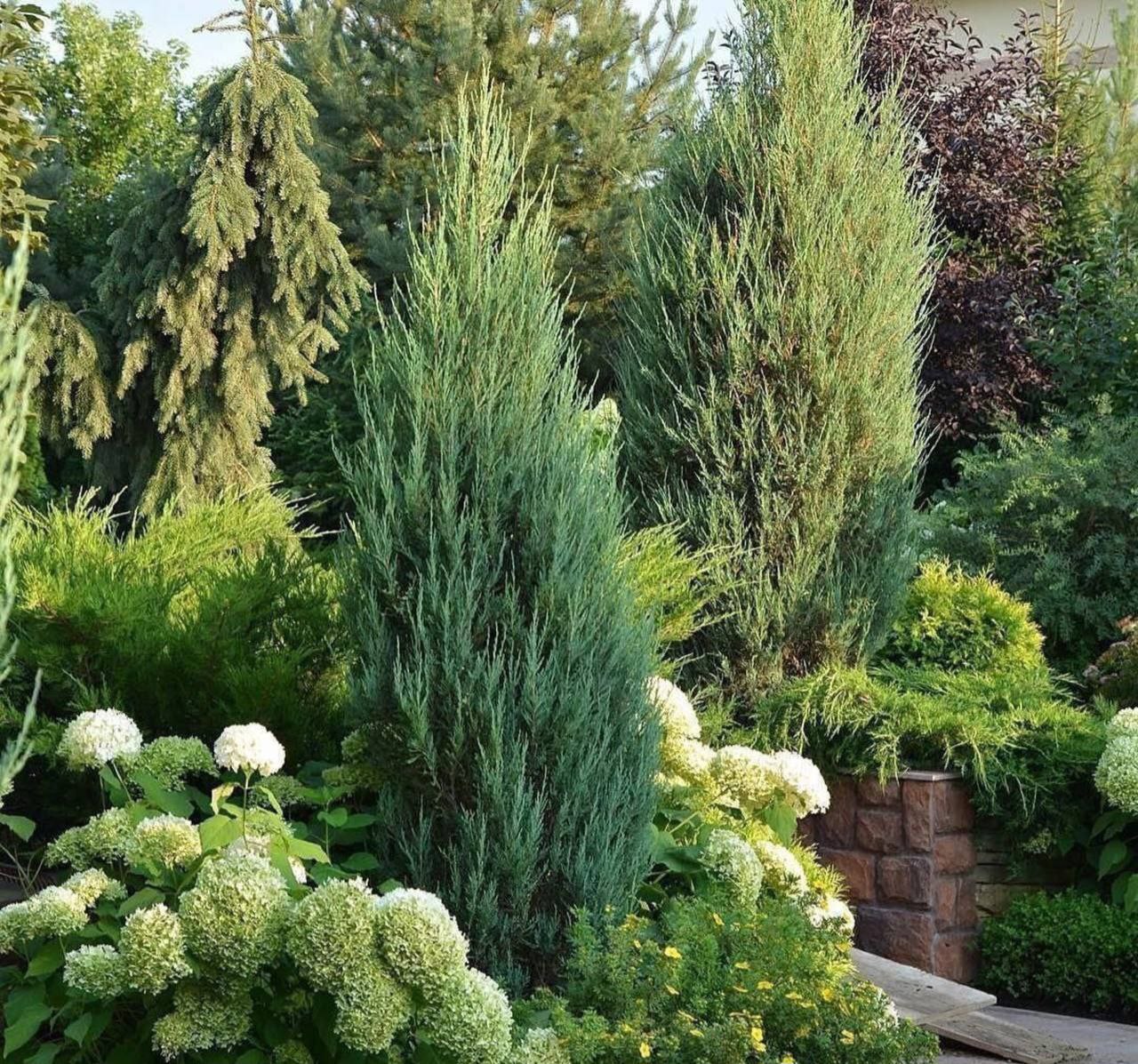 5) Змішані композиції. Ялівець добре поєднується з іншими хвойними рослинами, а також із листяними кущами та багаторічниками. Використання різних відтінків зеленого, синього та сріблястого кольорів додає глибини та текстури композиціям.