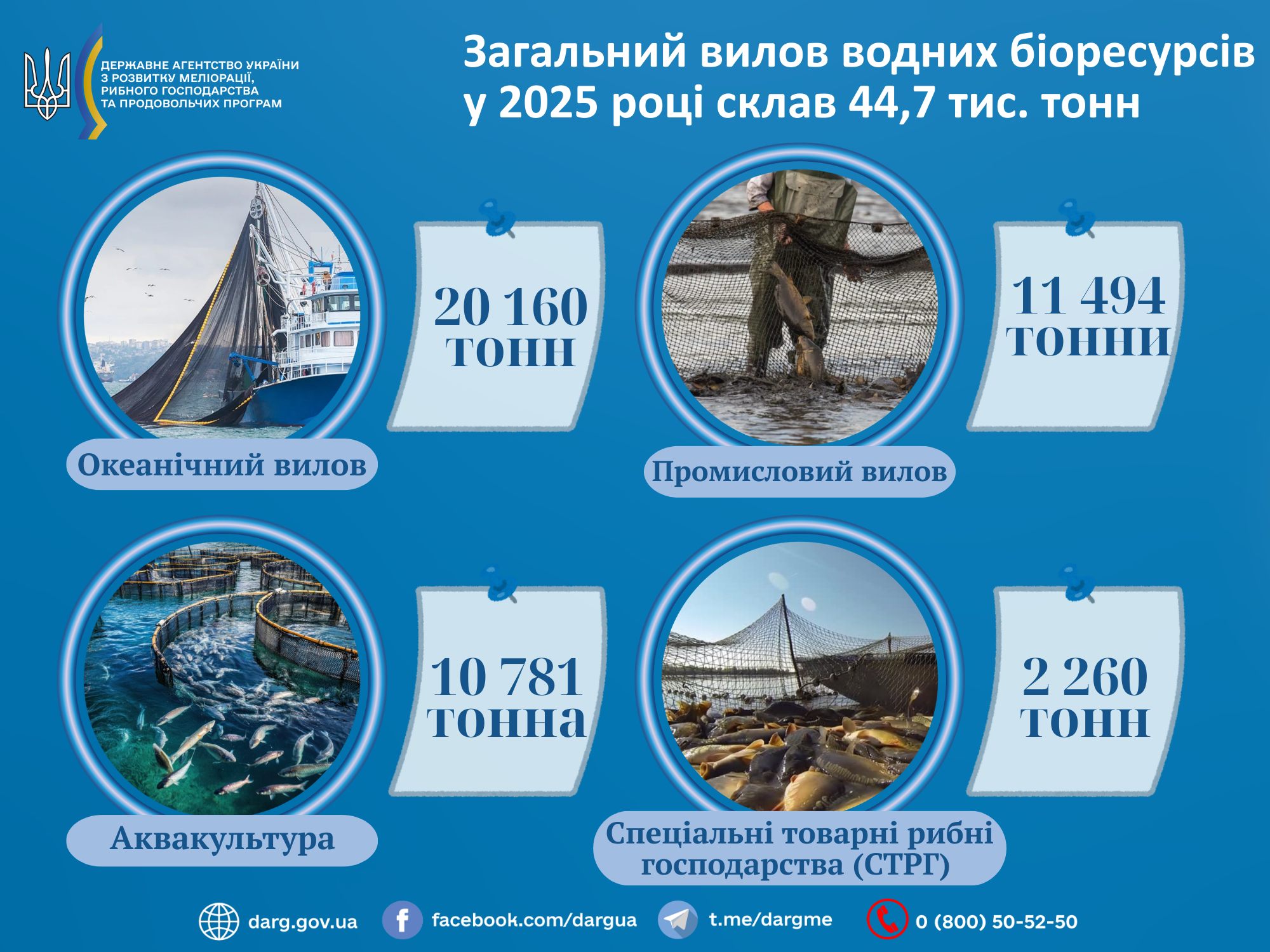 Загальний вилов водних біоресурсів у 2025 році склав 44,7 тис. тоннУ 2025 році загальний обсяг вилову риби та інших водних біоресурсів підприємствами рибної галузі України становив 44,7 тис. тонн.