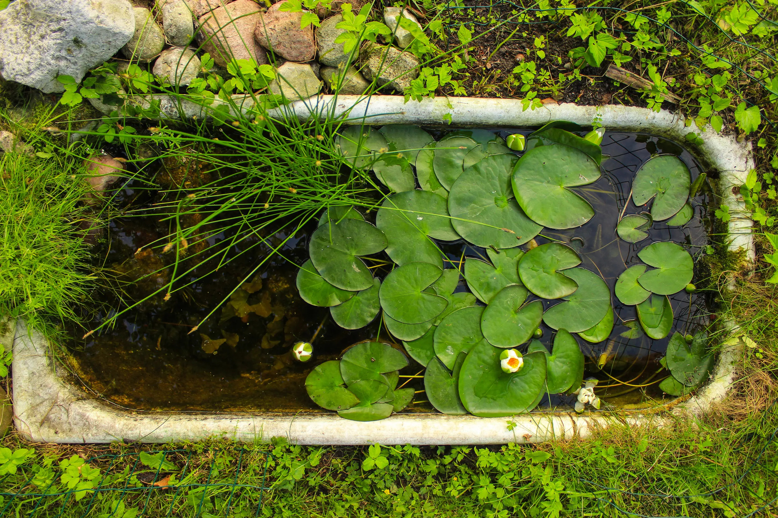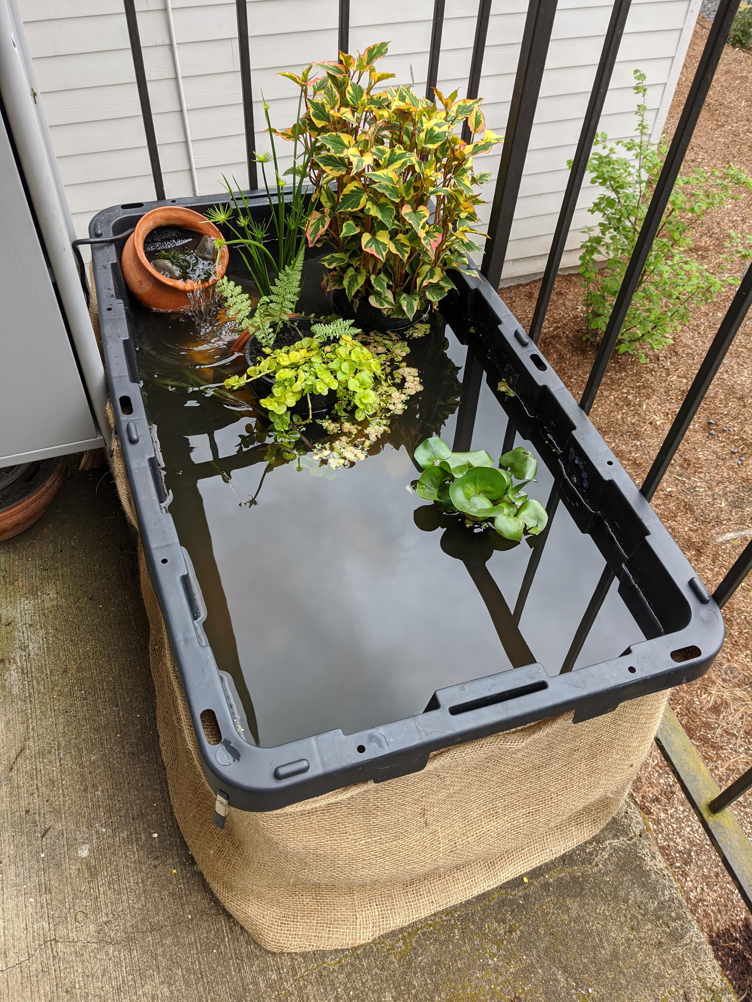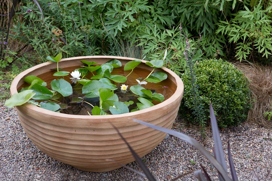 Посудина. Найкраще підійде стара дерев'яна діжка, яка додасть саду вінтажного стилю, чи великий керамічний або пластиковий вазон. Якщо посудина негерметична, її легко можна загерметизувати спеціальною плівкою. Розмістіть її в місці, де є легка тінь, щоб уникнути перегріву води.