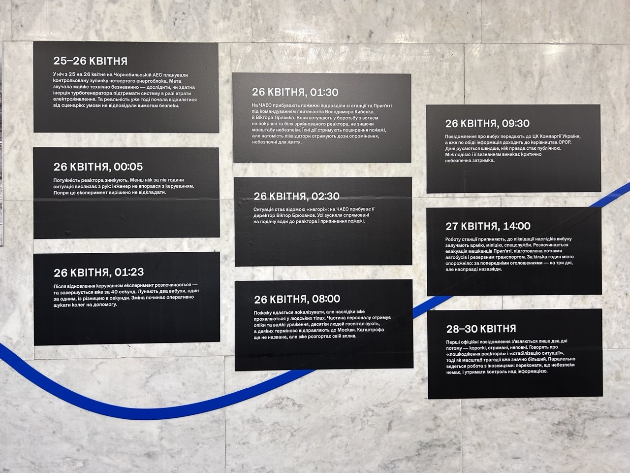 С помощью документальных свидетельств выставка проводит зрителей по пути от самой аварии на ЧАЭС и ликвидации её последствий до попадания российского дрона в новый безопасный конфайнмент (уникальное защитное арочное сооружение над разрушенным 4-м энергоблоком ЧАЭС, введенная в эксплуатацию для изоляции радиоактивных материалов на 100 лет. Огромное сооружение (165 м в длину, 110 м в высоту) предназначено для удержания пыли и позволяет проводить демонтаж старого саркофага) в феврале 2025 года.