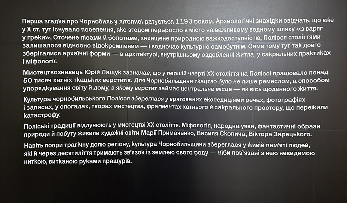 Тема Чернобыля здесь представлена не только как история аварии, но и как история всего Полесья — от первых упоминаний в летописях (1193 год) до наших дней.