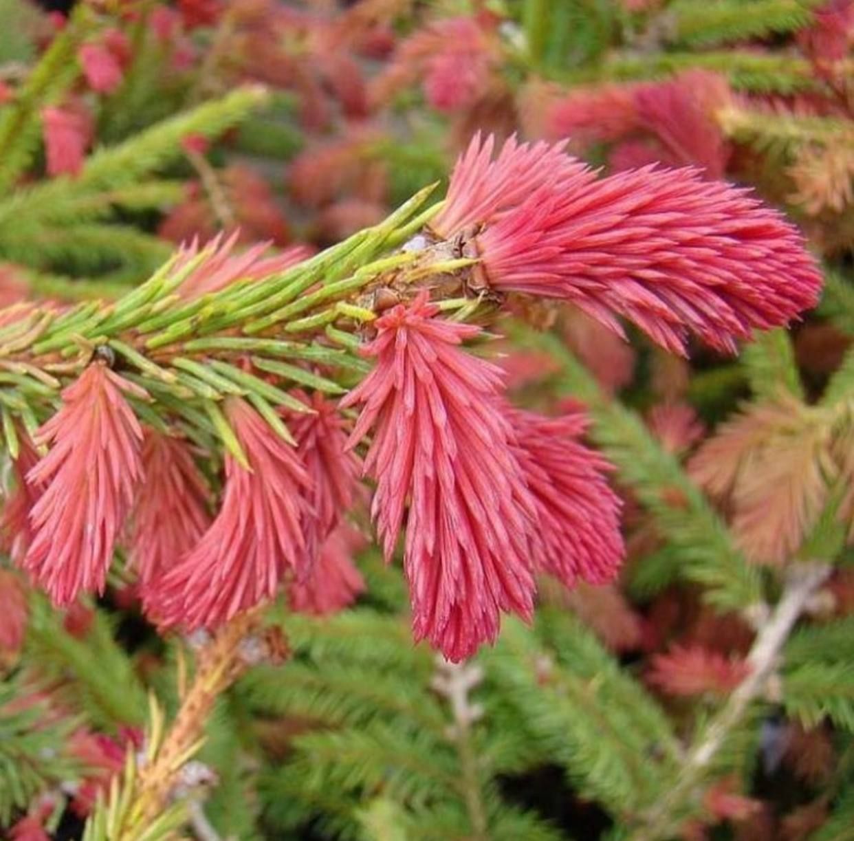 Взрослая хвоя зеленого цвета, а молодые приросты - малиновые, что придает ей необычно фантастический вид. Высота взрослого 10-летнего растения до 2 м, максимальная высота очень взрослого растения до 7 м. Годовой прирост 15 - 30 см. Может расти как на открытых, солнечных местах, так и в притененном месте.