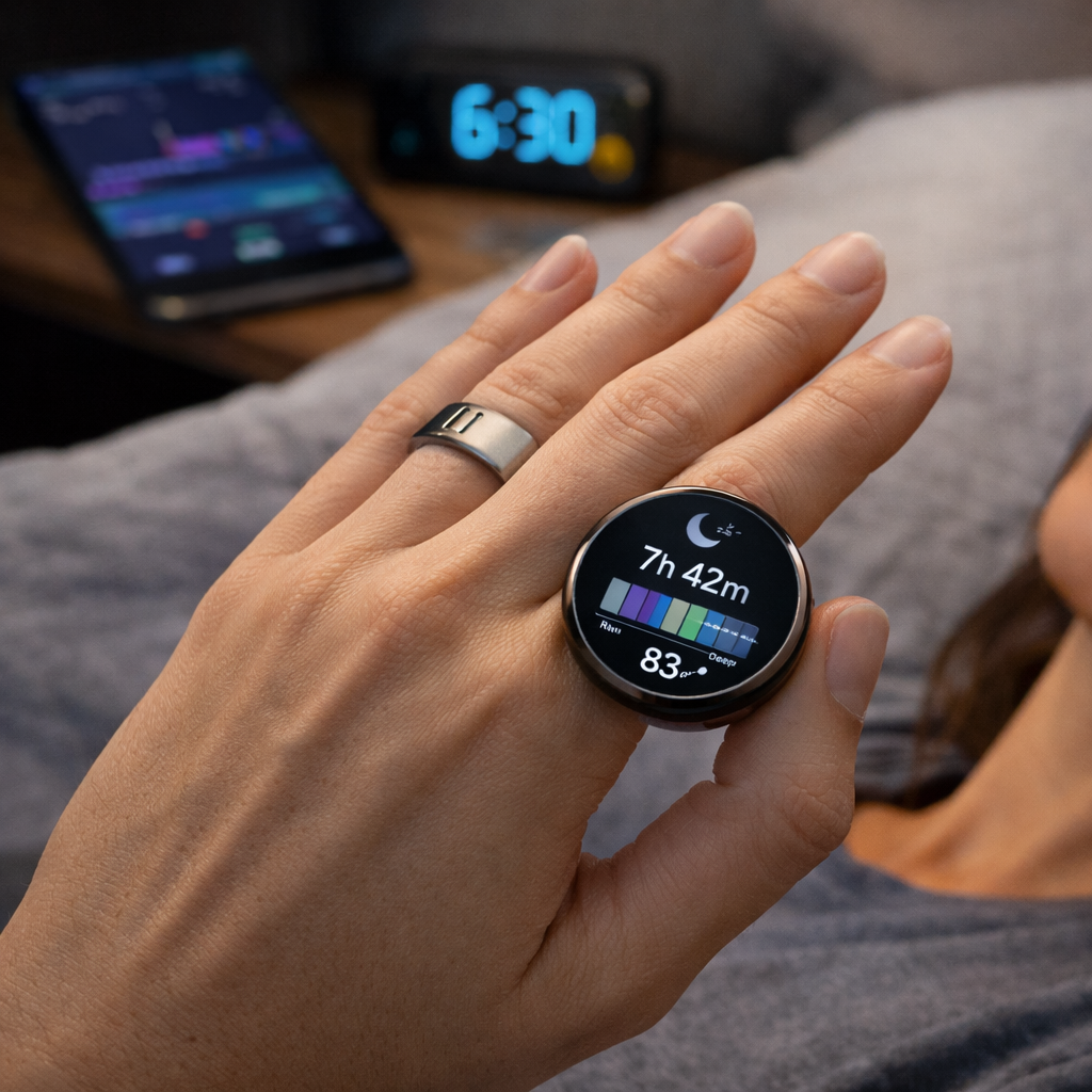 Менее заметный вариант — так называемые «умные» кольца. Они также отслеживают физиологические показатели и могут предоставлять подробный анализ сна.