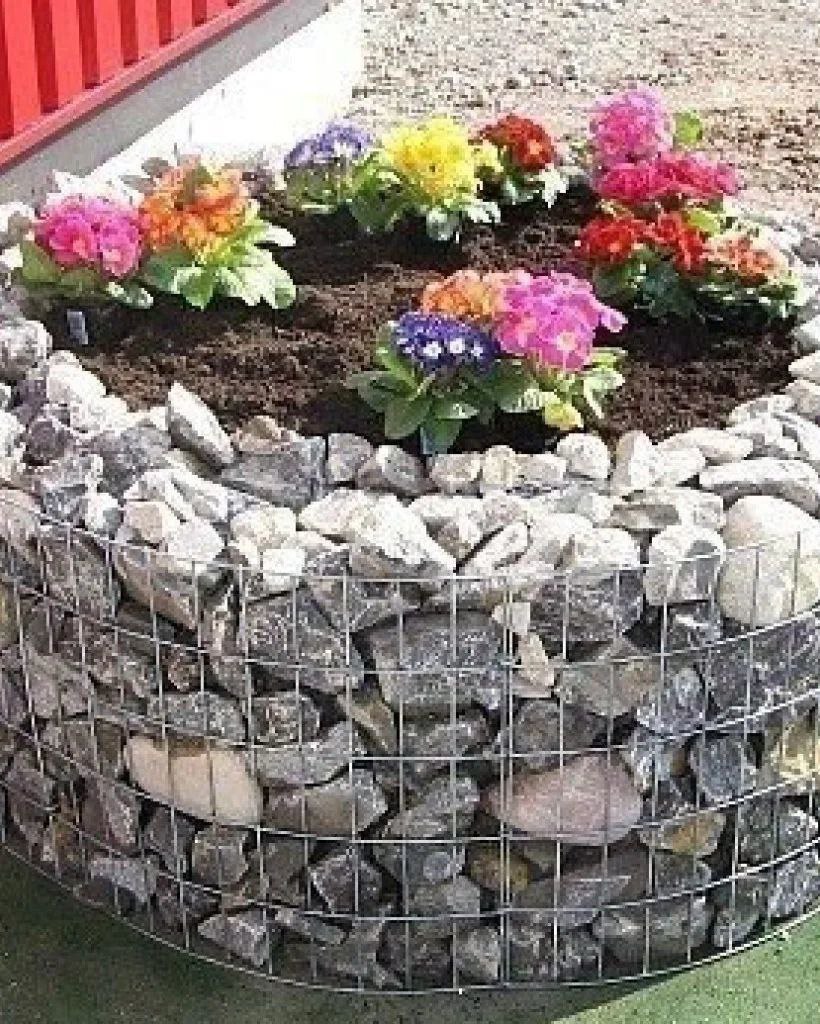 - Клумбы и цветники. Используйте габионы как бортики для поднятых клумб или создавайте многоярусные цветники, которые будут выглядеть как миниатюрные альпинарии.