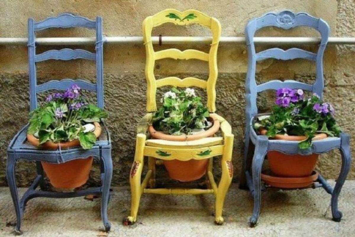 Старый стул - если вынуть сиденье, он станет отличной мобильной подставкой для вазонов. Чтобы обеспечить устойчивость, ножки можно немного углубить в землю.