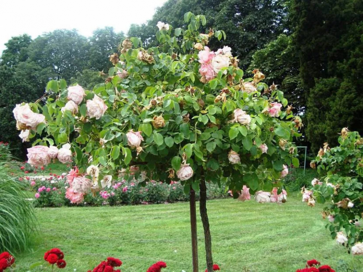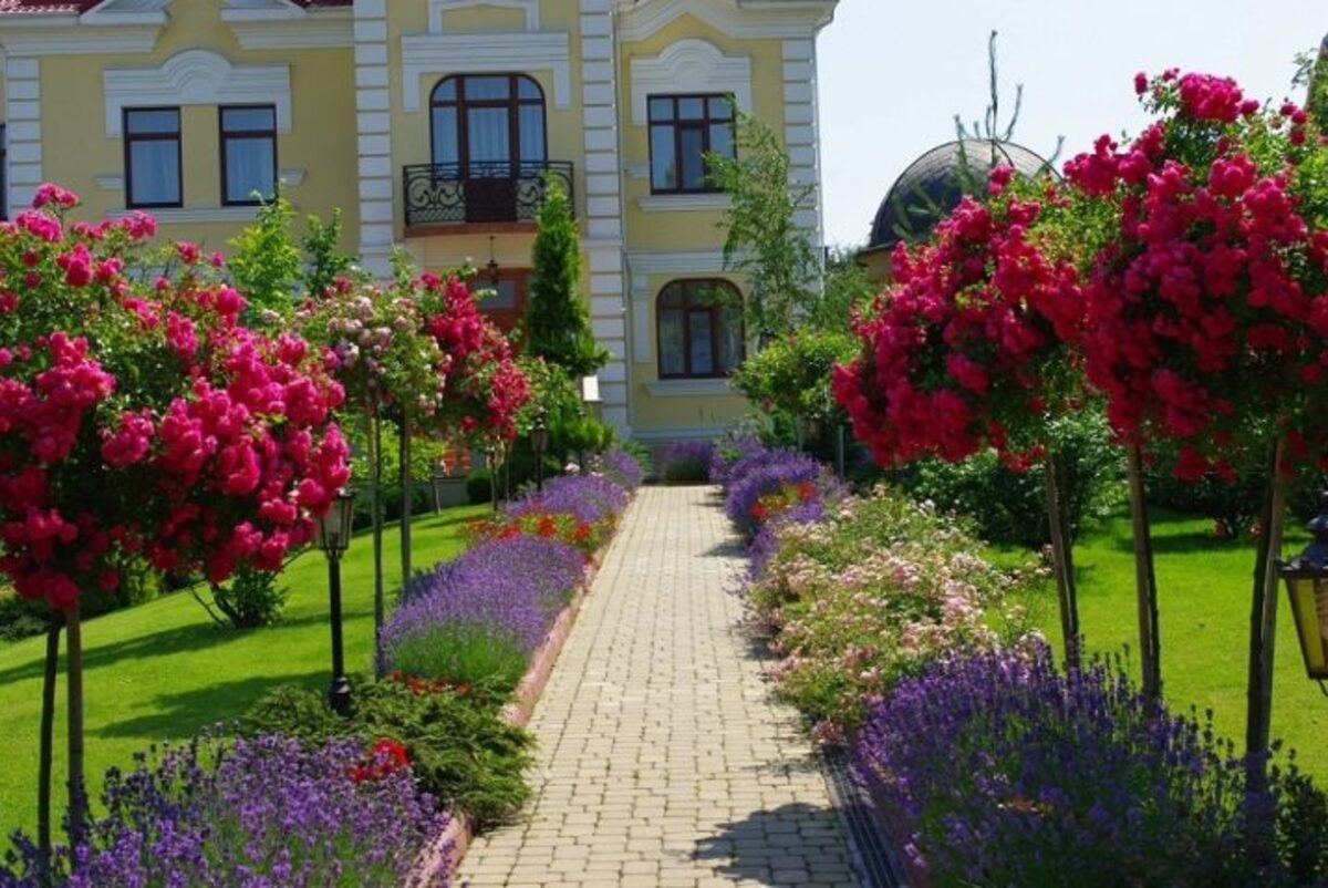 Для создания интересных садовых композиций в частном доме идеально подойдут штамбовые сорта роз. В таких сочетаниях этим растениям отводится самая главная роль. Все остальные посадки служат лишь как гармоничный фон.