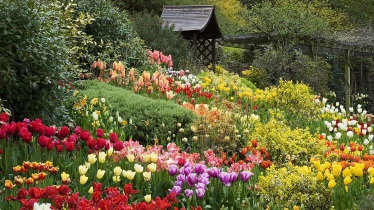 - Яркие цветники с яркими цветочными композициями.