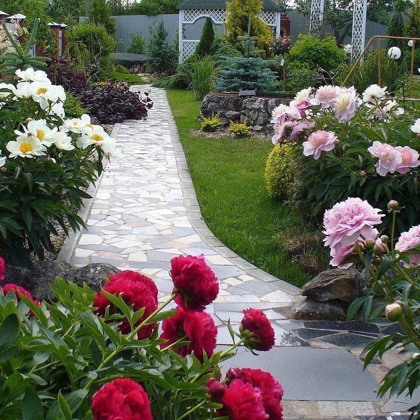 Оформление садовых дорожек. Высаживайте пионы вдоль садовых дорожек. Их пышные цветы создадут живописный вид, а аромат добавит уюта.
