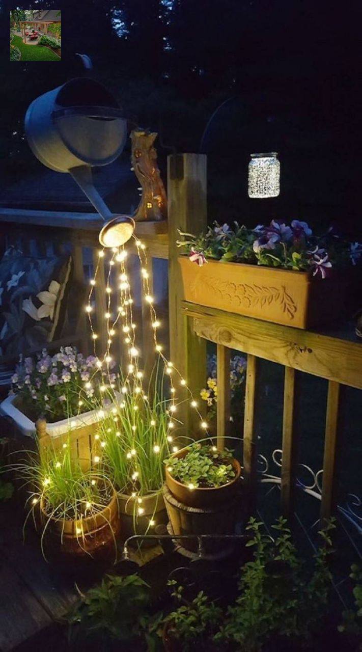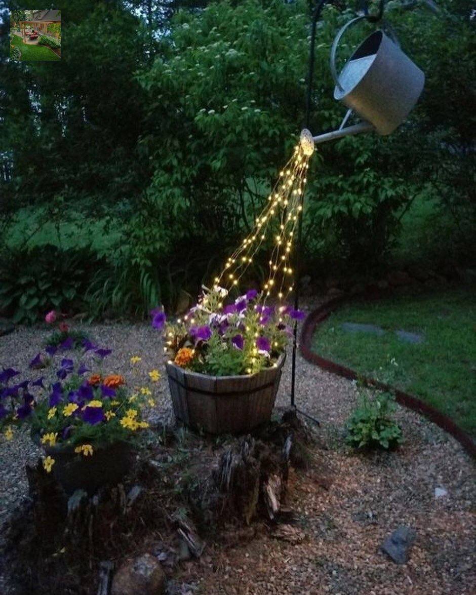 Освещение сада может быть не только функциональным, но и по-настоящему волшебным. В последнее время особую популярность приобрели креативные световые инсталляции, где главным элементом выступает обычная лейка, которая будто бы изливает сияние.