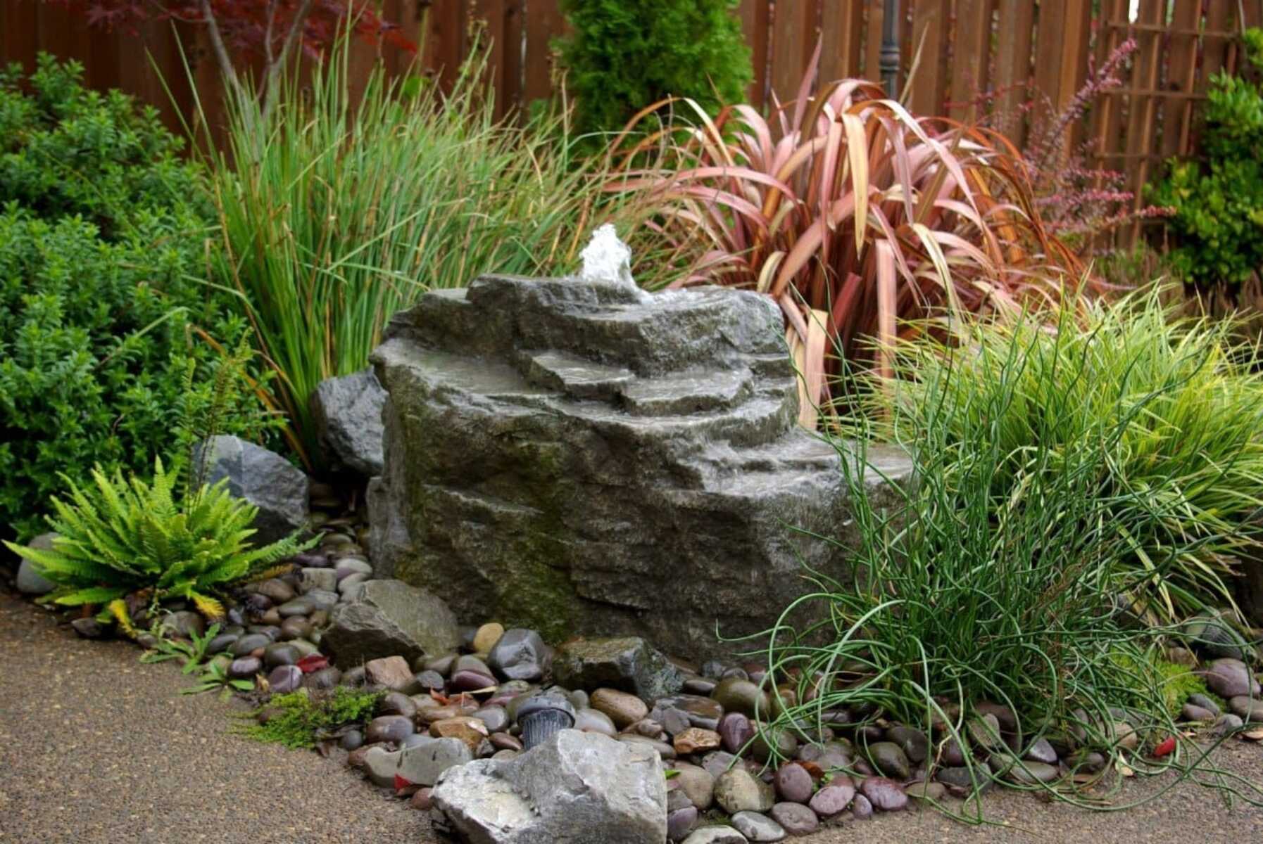 Якщо у вас мало простору, можна створити фонтан із пластикових або бетонних контейнерів, які гарно маскуються під декоративні елементи, наприклад, кам’яні чи дерев’яні структури.