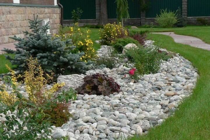 Важную роль играют элементы хардскейпа, особенно гравий и декоративные камни. Они используются не только для дорожек, но и как основное покрытие для посадочных зон, что прекрасно смотрится в сочетании с растениями и минимизирует рост сорняков. Контраст светлых камней с насыщенной зеленью создает впечатляющий визуальный эффект, а крупные валуны могут выступать как самостоятельные скульптурные акценты, добавляя саду естественности и характера.