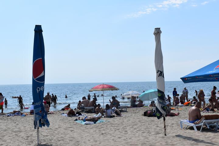 Пляж – полная противоположность улицам в центре города: сотни людей под зонтиками, на лежаках или на собственных полотенцах прямо на песке. Ближе к воде — больше громко кричащих детей, прыгая в море. Между этим бегают женщины с тяжелыми сумками и привычным для черноморских пляжей возгласом: «Пахлава, горячая кукуруза!» Креветки стоят 100 грн за 100 г, медовая пахлава – 80, столько же – сладкие трубочки, кукуруза – 70 грн.