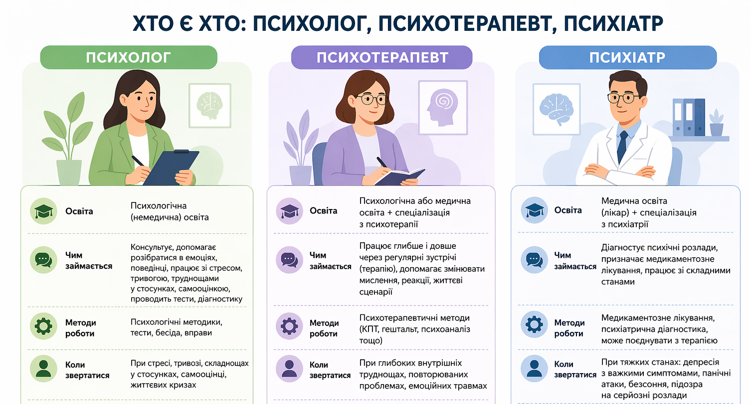 Психотерапевт — психолог или врач с дополнительной специализацией по психотерапии. Он работает глубже и дольше посредством регулярных встреч, помогает изменять мышление, реакции и жизненные сценарии, используя конкретные методы (КПТ, гештальт, психоанализ и т. д.).