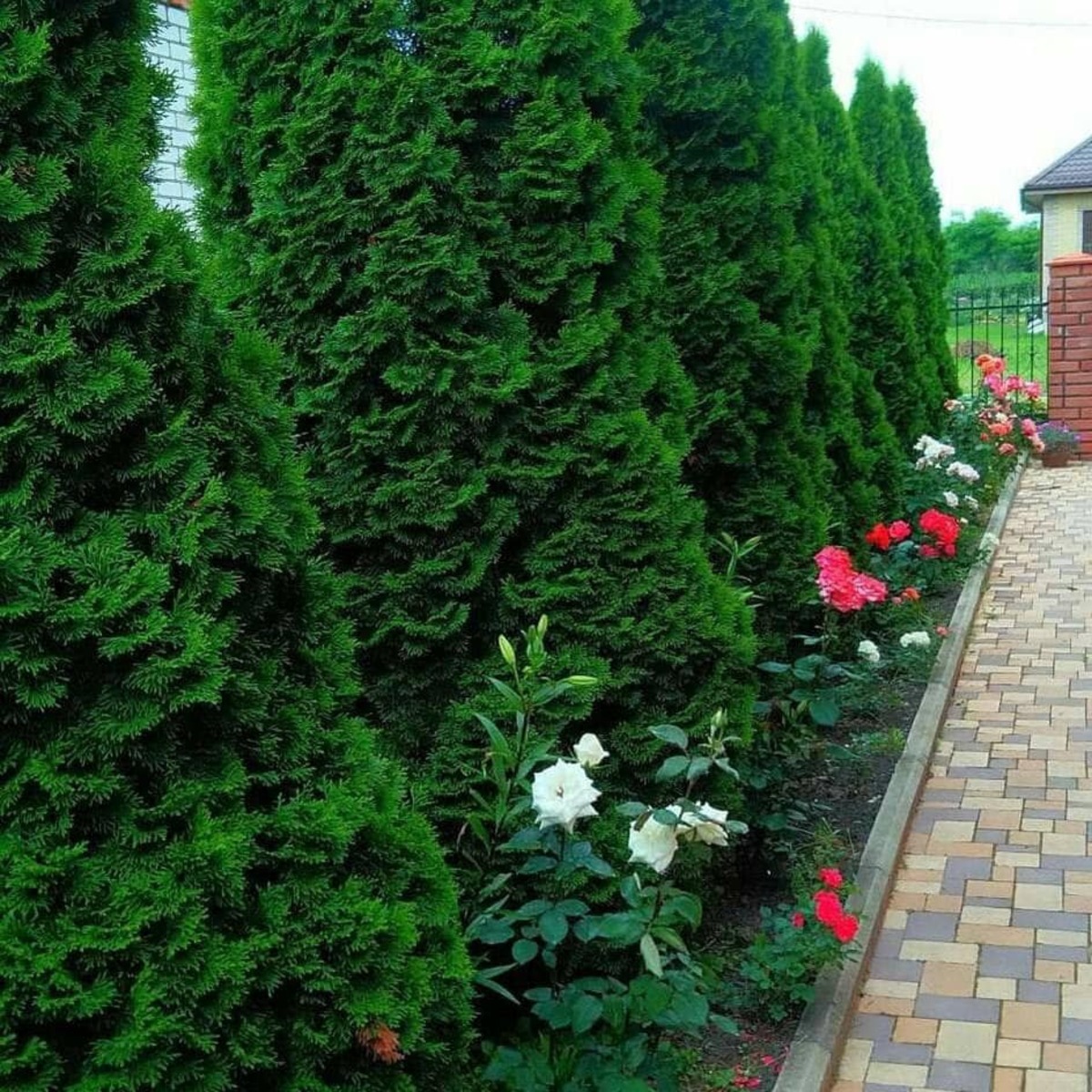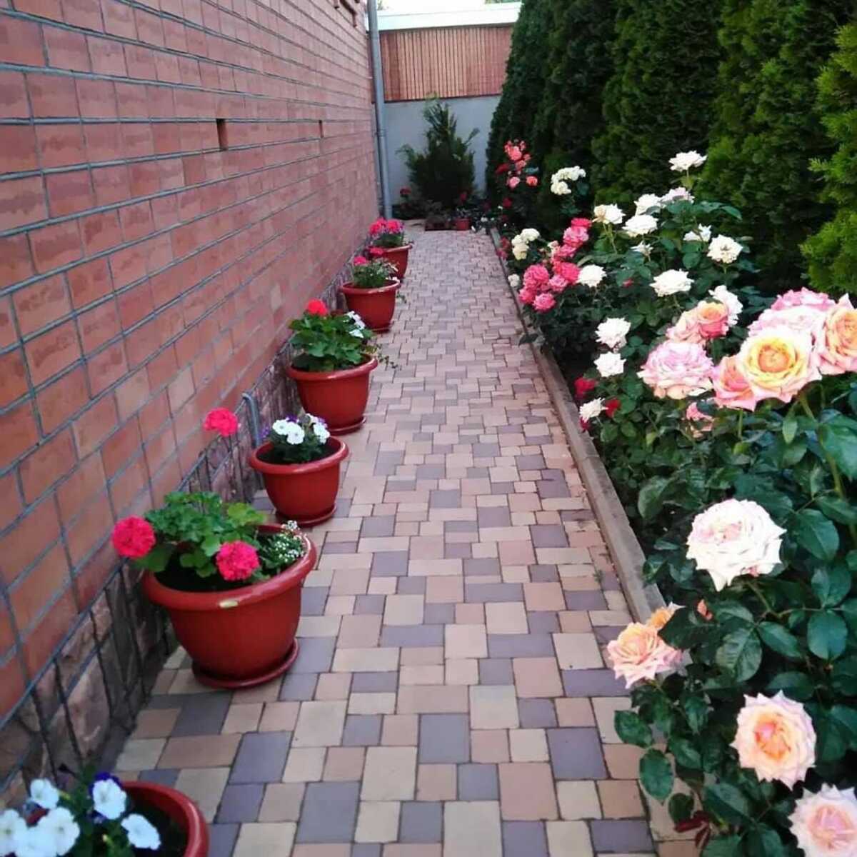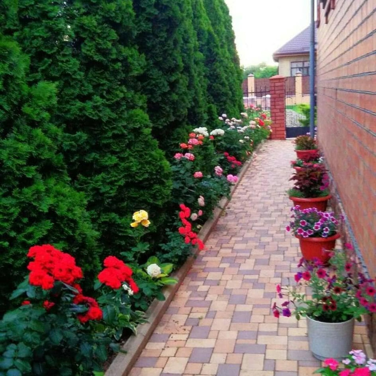 Изящные туи станут прекрасным фоном, подчеркивая красоту и яркость роз и добавляя структурности композиции. Хосты помогут прикрыть почву и создать зеленый ковер, который придаст целостности и завершенности общему виду. Для дополнительных акцентов можно использовать однолетние цветы в кашпо - они добавят ярких красок и сделают проход вдоль дома еще более живым и уютным.