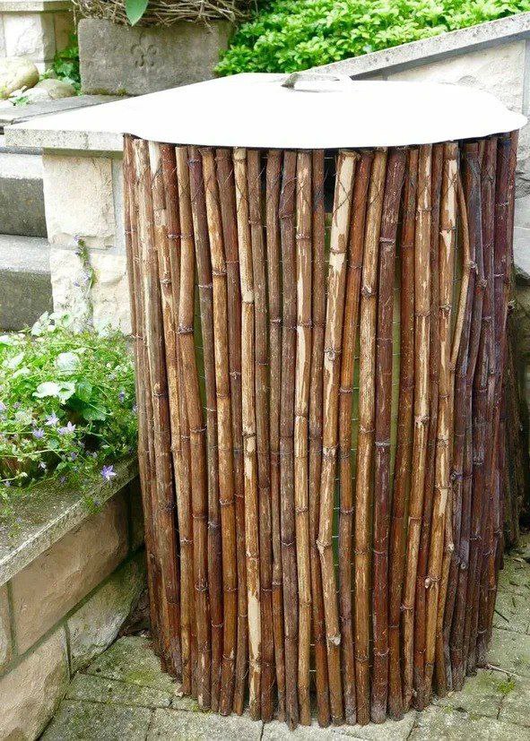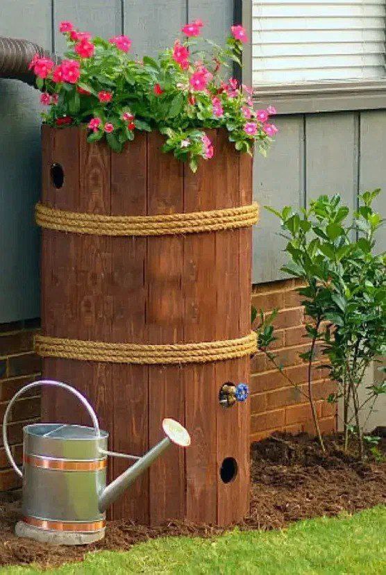 Бочка может стать частью природы: обклейте ее имитацией коры дерева или покрасьте в зеленый цвет с листьями, чтобы она сливалась с садом. Или же добавьте ей винтажный шарм — искусственно состарите поверхность, добавьте металлические обручи и табличку с надписью в стиле старинного винного погреба.